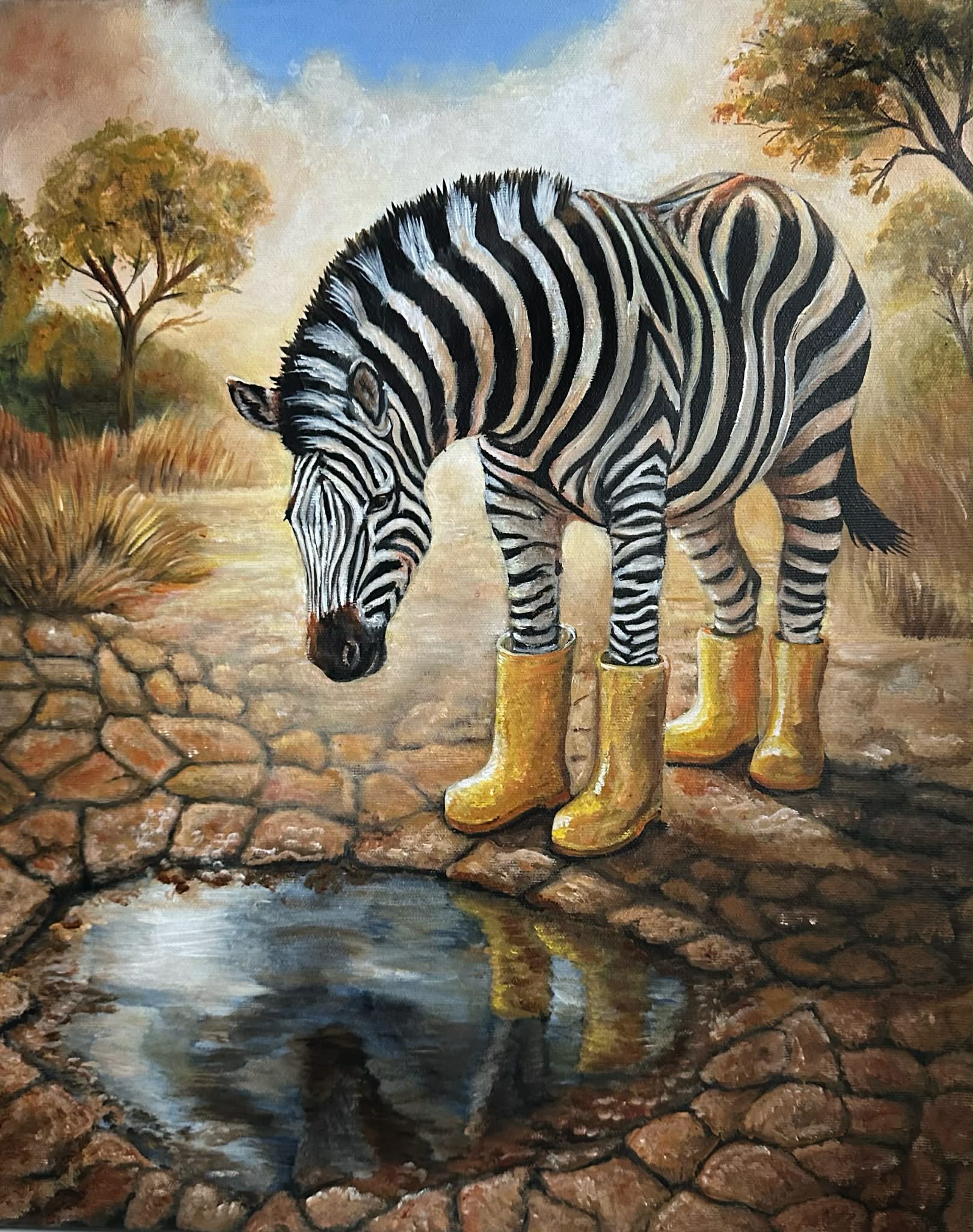 Det er malet med Amsterdam-akrylmaling og efterfølgende lakeret for at beskytte kunstværket, samtidig med at det fremhæver farvernes dybde.